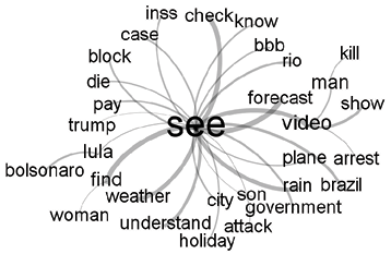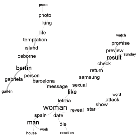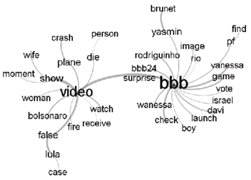 Additionally, to better understand the occurrence of clickbait, a similarity graph visualization was employed. Similarity graphs are graphical representations that depict relationships between words or categories based on their co-occurrences within a text corpus, helping to detect words that frequently appear together and reveal semantic or thematic associations. In content analysis, similarity graphs are useful for understanding lexical networks and identifying clusters of terms that share conceptual proximity. Using statistical methods such as Vergès’ similarity analysis, the connections between terms are displayed in a network format, where nodes represent words and edges indicate the strength of their co-occurrence (Veremyev et al., 2019).