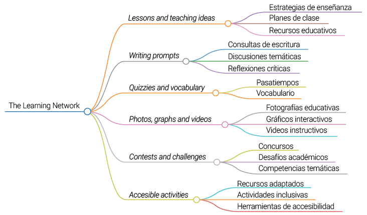 En primer lugar, en el espacio norteamericano, The Learning Network (ver Figura 1) implementa varias acciones, que incluyen lecciones e ideas de aprendizaje (lessons and teaching ideas), consultas (writing prompts), pasatiempos (quizzies and vocabulary), fotos y videos (photos, graphs and videos), retos (contests and challenges) y actividades accesibles (accessible activities). Esta variedad de recursos combina contenidos educativos, lúdicos, visuales, prácticos e inclusivos, lo cual favorece un desarrollo idóneo, principalmente para la población joven (Priede, 2019).