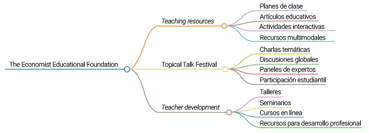 En el entorno europeo, The Economist Educational Foundation se distingue por proporcionar materiales educativos (teaching resources), que permiten a los estudiantes abordar temas complejos y desarrollar habilidades críticas de pensamiento. Este enfoque fomenta debates (Topical Talk Festival) y reflexiones profundas, con el fin de facilitar su participación en cuestiones relevantes de la actualidad, así como la formación docente (teacher development) (véase la Figura 3).