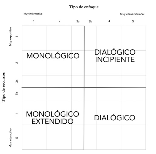 El enfoque conversacional rara vez es la forma predominante de comunicación institucional (Lovejoy & Saxton, 2012). Bajo esta visión, se busca establecer y construir relaciones que permitan el diálogo y la interacción entre la organización y sus públicos con un receptor más activo (Men et al., 2018).
