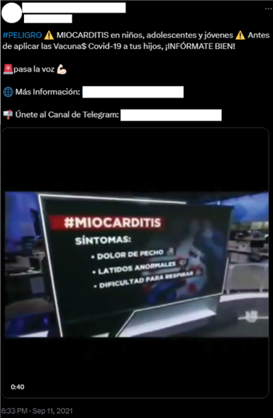 En las publicaciones con este tipo de orientación, se suelen desplegar las técnicas de contexto falso y contenido manipulado para presentar los casos aislados de efectos secundarios —sobre todo relacionados con la miocarditis—, extraídos en su mayoría de noticias de prensa y televisión, y de reportes científicos, como si fueran casos comunes y letales. Además, recurren con frecuencia a testimonios de expertos que mencionan los efectos de la vacunación en niños y jóvenes, con el fin de alimentar el pánico moral.