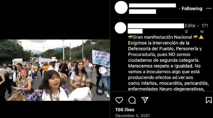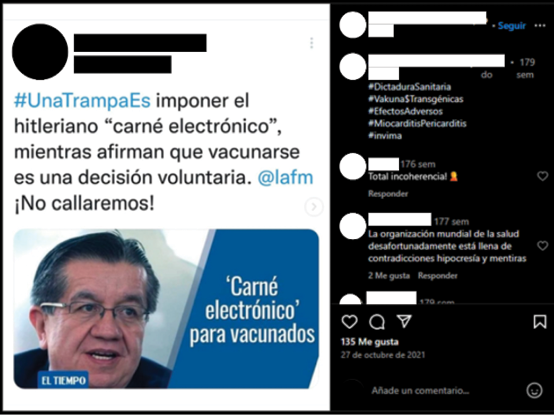 En el comentario de la publicación de Instagram, se incluyeron los hashtags #DictaduraSanitaria y #Vakuna$Transgénicas, asociados a teorías conspirativas; #Invima, relacionado con la institución sanitaria encargada de regular las vacunas en Colombia; y también hashtags vinculados con términos científicos sobre los efectos secundarios (#EfectosAdversos y #MiocarditisPeriocarditis).
