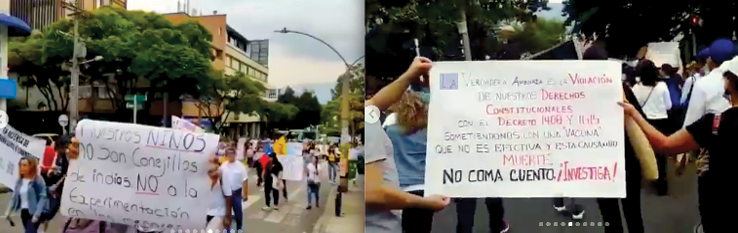 Los videoclips, por su parte, complementan la narrativa multimodal orientada a la construcción de la identidad, pues ofrecen evidencia de la movilización ciudadana desde el punto de vista de los manifestantes y representan —tanto en el modo visual, a través de las pancartas que llevan los manifestantes (Figura 3), como en el audio de las voces— mensajes antivacunas. Varios de estos carteles mencionan la defensa de los derechos y el carácter experimental de las vacunas; por ejemplo, en los enunciados como Sí es un experimento: miocarditis y Nuestros niños no son conejillos de indias. No a la experimentación, se refieren narrativas que, mediante el uso de técnicas de contenido fabricado y contenido manipulado, equiparan la aplicación de las vacunas a un experimento adelantado por Gobiernos y empresas farmacéuticas.