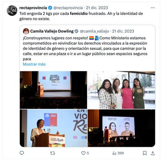En las redes analizadas, la erosión del contexto social adquiere una modalidad radical y activa. Aquí, las imágenes no solo omiten la contextualización estructural, sino que recontextualizan visualmente la problemática, al incorporar representaciones visuales que desplazan la atención hacia otras agendas, como la seguridad pública, la defensa de las instituciones tradicionales o discursos antifeministas explícitos. Por ejemplo, en la Figura 5, se cita una publicación institucional de la ministra Camila Vallejo sobre espacios seguros y derechos de género, la cual es respondida con un comentario ofensivo sobre el cuerpo de una de las personas fotografiadas. Las ideas de respeto a la diversidad corporal instaladas por el feminismo, y visibilizadas en la imagen, son ridiculizadas por esta cuenta/influencer. Este mecanismo instala un debilitamiento simbólico de las políticas públicas en torno al tema del feminicidio al intentar normalizar un humor agresivo que niega las categorías de género.