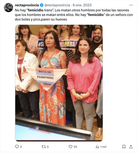 Nota. De “No hay ‘femicidio trans’. Los matan otros hombres por todas las razones que los hombres se matan entre ellos. No hay ‘femicidio’ de un señoro con dos bolas y pico, paren su hueveo”, por @rectaprovincia, 6 de enero del 2023b. X (https://x.com/rectaprovincia/status/1611416591882665991?s=20).
