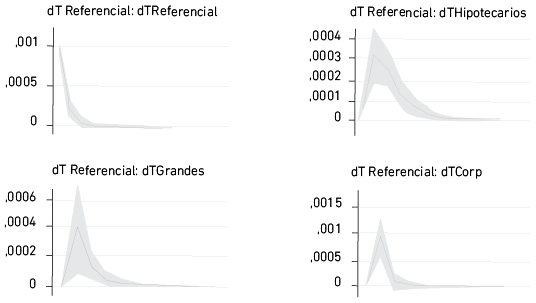 La Figura 1 muestra las funciones de impulso-respuesta del modelo A. Especí-ficamente, se ve el efecto de la tasa de interés de referencia sobre las distintas tasas de interés por tipo de crédito. De ahí se deduce que un cambio (shock) en la tasa de interés de referencia afectará positivamente a las tasas hipotecarias, de consumo y de empresas pequeñas, medianas y corporativas, mientras que afectará negativamente a las tasas de grandes y microempresas.