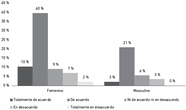 La Figura 1 resume las respuestas, divididas por la variable sexo, respecto a la afirmación de si las prendas fast fashion representan un gran porcentaje en el armario de los encuestados. La mayoría de hombres y mujeres están de acuerdo con esta afirmación. De este grupo, el 10 % de las mujeres reporta estar “totalmente de acuerdo”. Por otro lado, la proporción de encuestados que reportan que estas prendas no forman en absoluto parte de su armario es extremadamente baja (2 % en el caso de mujeres y 0 % en el caso de hombres). Esta información corresponde a lo establecido por Peters et al. (2021), quienes indican que el incremento de las compras de ropa per cápita en un 47 % contrarresta los efectos positivos que podría generar la actual disminución de huella de carbono por prenda. Se afirma que dicho comportamiento del consumidor es potenciado, sobre todo, por el modelo de negocio del fast fashion. Este gran consumo se ve reflejado en los indicadores de contaminación a nivel mundial indicados por Toboso-Chavero (2017). La contaminación de esta industria no solo se centra en la producción, sino también en los componentes tóxicos que liberan las prendas al ser lavadas.
