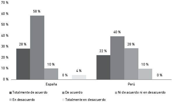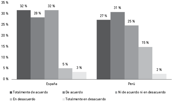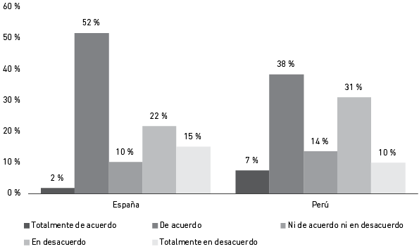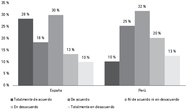 La Figura 4 muestra los resultados frente a la pregunta de si se considera que las firmas fast fashion no generan un impacto tan perjudicial en el medio ambiente en comparación con otras industrias. La respuesta que más destacó en ambas muestras fue “de acuerdo”, por lo que se entiende que tanto españoles como peruanos piensan que este sector no es uno de los grandes contaminadores a nivel mundial.