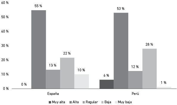 La Figura 3 muestra las expectativas que tienen los consumidores de ambos países respecto de las prendas fast fashion. Se puede observar que en ambos países la mayoría espera una calidad “alta”: 55 % en España y 53 % en Perú. No obstante, un 22 % de los consumidores españoles y un 28 % de los consumidores peruanos esperan una calidad “baja”. Por tanto, se concluye que las expectativas de los consumidores peruanos son un tanto menores que las de los españoles respecto de la calidad de las prendas. Con relación a este punto, se debe recalcar que este modelo busca ahorrar costos en factores como la calidad, lo que ocasiona que muchos desechen sus prendas antes de su ciclo de vida útil regular (Zamani et al., 2017).