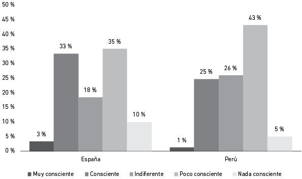 La Figura 6 presenta los resultados sobre el grado de consciencia de los consumidores al momento de comprar prendas fast fashion. Se observa que la opción más mencionada por los encuestados, tanto españoles como peruanos, fue “poco consciente”, con un 35 % y 43 % respectivamente. No obstante, el 33 % de los consumidores españoles menciona que el comprar prendas fast fashion constituye una decisión “consciente”. Cabe también notar que una proporción muy baja, tanto de consumidores españoles como peruanos, realiza tal tipo de compras de forma “muy consciente”.