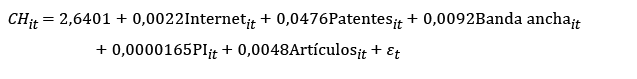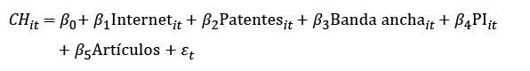 En cuanto a las variables exógenas, se consideran las siguientes: internet, patentes, banda ancha, propiedad intelectual (PI) y artículos científicos. Estas variables fueron extraídas de la base de datos del Banco Mundial.