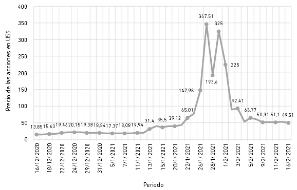 En el primer trimestre del 2021, la acción se disparó de forma impresionante: llegó a valorizarse en más de US$ 300 (Hotten, 2021). En este caso, las acciones subieron de US$ 20 a US$ 347 durante un periodo de dos semanas en enero. El 27 de enero del 2021, otro evento tuvo repercusión en la compra de acciones de GameStop. Elon Musk, presidente de Tesla, a través de su cuenta de Twitter, escribió el siguiente mensaje: “Gamestonk!!” y compartió el enlace del foro “Wall Street bets” de Reddit. Este comentario desató el precio de las acciones de GameStop e hizo que este se disparara nuevamente, lo que provocó que subiera el precio a US$ 325.