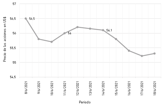 Evolución diaria del valor de las acciones de Coca-Cola desde el 8 hasta el 18 de junio del 2021 en dólares