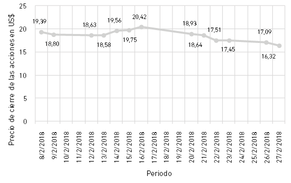 Evolución diaria del valor de las acciones de Snapchat desde el 8 de febrero del 2018 hasta el 27 de febrero del 2018 en dólares