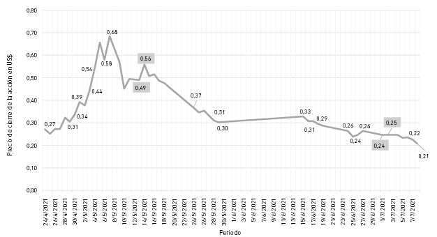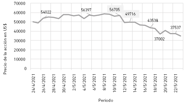 Si bien Musk ha mostrado cierta afinidad por las monedas digitales, también manifestó a sus seguidores su desacuerdo con ciertas particularidades. En julio del 2021, tuiteó acerca de la gran cantidad de energía que generaban los bitcoin, lo cual se relaciona con un estudio en el que se afirma que los desechos electrónicos derivados de dicha criptomoneda implican una amenaza en aumento para el medio ambiente (Vries & Stoll, 2021). Ello provocó una caída del precio de los bitcoin en 10 % en tan solo una semana. De hecho, el precio de la acción pasó de US$ 56 705 a US$ 49 716 a los dos días de lo comentado.