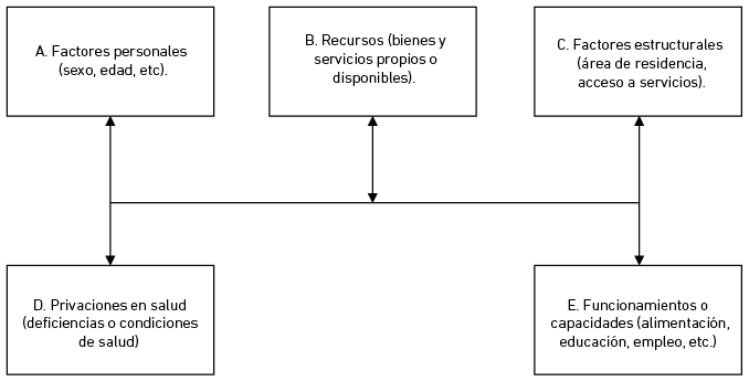 La Figura 1 ilustra cómo interactúan los elementos que componen el modelo de desarrollo humano. Si las dimensiones que componen la casilla E (educación, empleo, salud, entre otros) se encuentran por debajo de estándares mínimos, se dice que la persona se encuentra en condición de pobreza multidimensional. A su vez, las capacidades y funcionamientos interactúan con los factores personales (A), los recursos (B), los factores estructurales (C) y las privaciones de salud (D) que afectan a la persona.