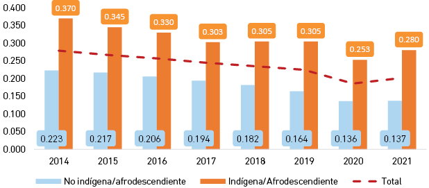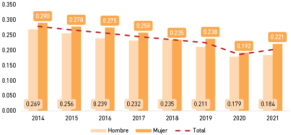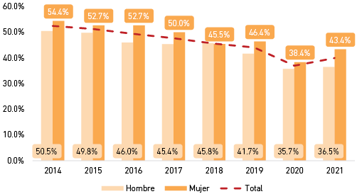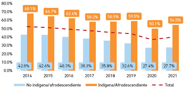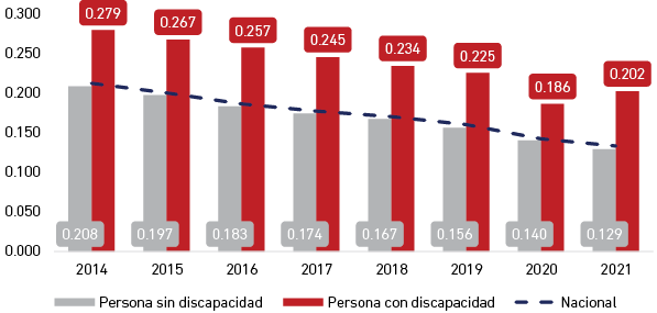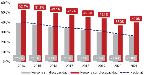 Se evidenció que la población con discapacidad se encuentra sistemáticamente en una situación de mayor pobreza multidimensional. Los resultados mostraron una brecha persistente que coloca a las personas con discapacidad en situación de desventaja, con un aumento del 12,7 % en el 2014 a 14,2 % en el 2021. Aunque la pobreza multidimensional disminuyó en ambas poblaciones, la brecha entre ellas se mantuvo constante y se incrementó en el último año.