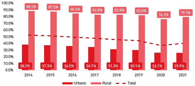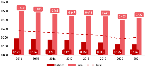 La Figura 5 presenta la desagregación de la incidencia de la pobreza multidimensional por área de residencia. En el panel A se observa que, en el año 2021, el 79,3 % de la población con discapacidad que reside en áreas rurales se encontraba en situación de pobreza multidimensional. Este valor supera en más de cincuenta puntos porcentuales al promedio urbano. En el panel B, la tasa de recuento ajustada muestra un patrón consistente de desigualdad entre los subgrupos a lo largo de los ocho años analizados.