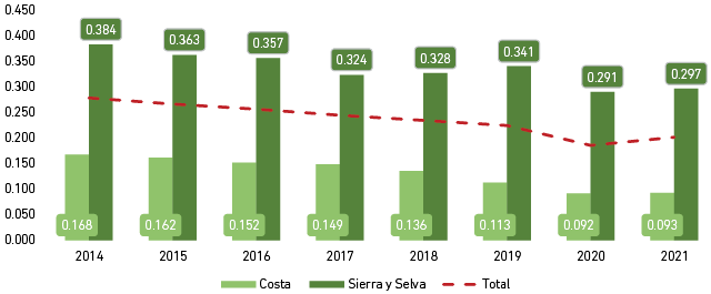 La Figura 7 presenta la desagregación de la tasa de incidencia (H) y la tasa de incidencia ajustada (M0) por regiones naturales. En el panel A se evidencia una diferencia estadísticamente significativa a lo largo del periodo estudiado: una brecha promedio de 36,3 %. Mientras tanto, el panel B muestra un patrón de comportamiento similar en los datos, con una desventaja notable en las personas que residen en la sierra o la selva.
