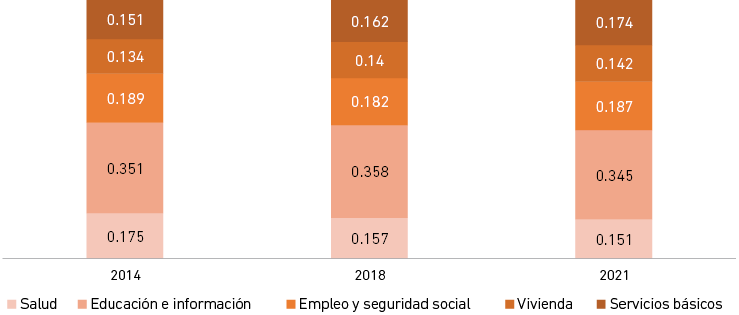 La Figura 8 muestra el análisis desglosado por dimensiones para las personas con discapacidad en los años 2014, 2018 y 2021. La dimensión con mayor incidencia en la situación de las personas con discapacidad en Perú es educación e información (0,351), seguido por las dimensiones de empleo y seguridad social (0,186), servicios básicos (0,162), salud (0,161) y vivienda (0,139), como promedio de los tres años.