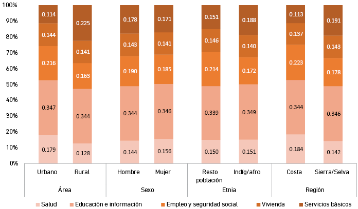 La Figura 9 presenta la descomposición por dimensiones de M0 para la población con discapacidad, desagregada por área de residencia, sexo, etnia y región natural. Educación e información (0,345) continúa siendo la dimensión que más contribuye en la situación, seguida por empleo y seguridad social (0,193), salud (0,154), servicios básicos (0,166) y vivienda (0,142), en promedio.