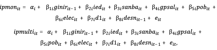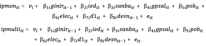 A fin de analizar y comparar los determinantes de la pobreza monetaria y la pobreza multidimensional, realizamos las estimaciones por medio de datos de panel tomando cada una de estas formas de medición de pobreza como variable dependiente. Para ello, se consideraron dos alternativas de especificación. En primer lugar, el modelo de efectos fijos dado, respectivamente, por