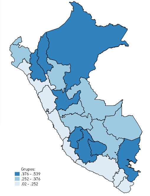 Finalmente, el componente de preparación es calculado por el porcentaje de hogares que tienen acceso a tecnologías de información y comunicación y los años promedio de estudio de la población de cada región. En el primer caso, se tomó dicha información directamente del módulo 1 de la ENAHO, relacionado con las características de la vivienda, y del módulo 3, sobre el nivel de educación de sus integrantes. El concepto intrínseco es que una población más educada e intercomunicada será capaz de responder adecuadamente frente a una amenaza derivada del cambio climático.