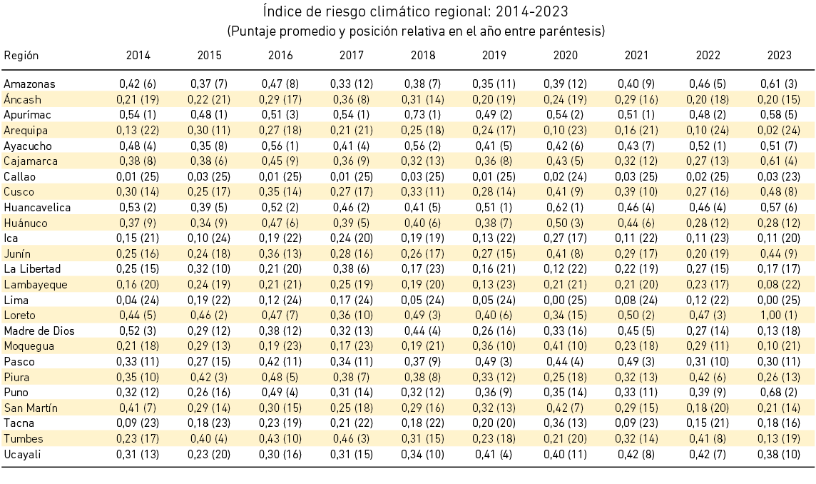 Los rankings que se presentan a continuación se calcularon con base en el promedio de los últimos diez años, con el fin de limitar la variabilidad que es frecuente encontrar en las ordenaciones que se producen con datos de frecuencia anual5. De esta manera, se evita que un evento puntual como el fenómeno de El Niño del 2017, que causó una grave destrucción en la región Piura y la colocó en la séptima posición, no exacerbe el real riesgo de esta zona, pues dicha región pasó a ubicarse en la décimo octava posición al cabo de tres años (véase el Anexo 1).