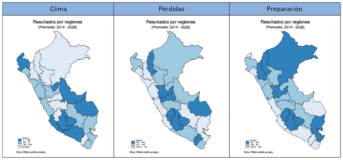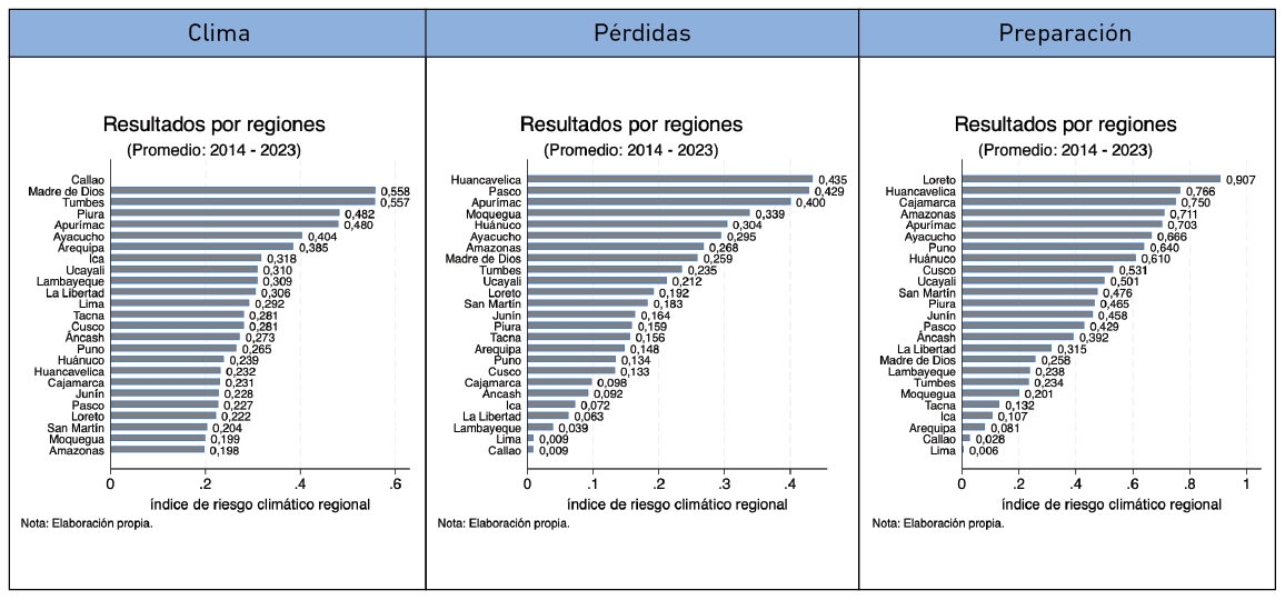 Entre los indicadores considerados en la construcción de estos índices destacan hechos como los desvíos del clima, por ejemplo, Lambayeque ha sido la región que ha registrado el mayor calentamiento en su temperatura promedio (entre el 2014 y el 2023). En lo que respecta a daños, San Martín se erige como la región que mayor superficie de bosque ha perdido en términos relativos, mientras que, en lo referente a preparación, las regiones de Lima y Callao resaltan como las mejor preparadas en virtud de su mayor educación y acceso a las tecnologías de información y comunicación.