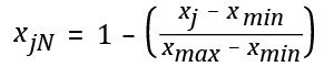 En esta fórmula, al valor original de la variable ( xj ) se le resta el valor mínimo (el menor registro entre las veinticinco regiones de las cuales se cuenta con información) y, posteriormente, se le divide entre el rango (diferencia entre el valor máximo y el mínimo), con lo que se obtiene la medición normalizada ( xjN ). Cabe señalar que, en el caso de las variables del grupo de preparación, para la normalización se aplica la siguiente fórmula (puesto que un mayor valor para estas variables reduce y no incrementa el riesgo):