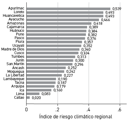 RESUMEN. La reciente literatura empírica reconoce que el cambio climático es una seria amenaza para las perspectivas de crecimiento de nuestra economía, ya que podría afectar de manera severa el bienestar y las proyecciones de empleo de las futuras generaciones. Por ello, es importante reconocer qué tan expuestos estamos frente a la amenaza del calentamiento global. No obstante, los indicadores de medición del riesgo, como los del Germanwatch o de la Universidad de Notre Dame, se publican generalmente para todo un país, a pesar de que, en la mayoría de casos, los daños producidos por un evento climático extremo se centran en áreas más reducidas, como una ciudad o región. En tal sentido, el presente trabajo introduce una medición del riesgo climático a escala regional aplicable al Perú, que permite apreciar que las regiones del trapecio andino (Apurímac, Huancavelica y Ayacucho) y algunas del Oriente (Loreto y Amazonas) son las más sensibles a los riesgo del cambio climático, en tanto que las regiones de la costa se encuentran en una situación relativamente más segura.