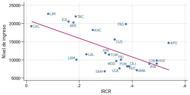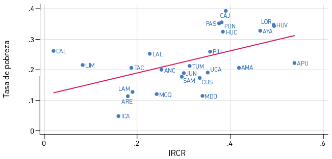 Las zonas de la costa suelen ser también las más productivas del país, mientras que las del oriente y el trapecio andino son las más rezagadas, por lo que cabría esperar una relación significativa con indicadores que recojan dicho estado. Por ejemplo, si se analiza el ordenamiento que produce el ingreso por habitante en el 2022 con el del IRCR, se encuentra un coeficiente de rangos de Spearman de 0,94; y, si se analiza con el de la tasa de pobreza para ese mismo año, el coeficiente asciende a 0,74. Evidencia de ello es que Lima ocupó el segundo puesto, de acuerdo con el PBI por habitante (por detrás de Moquegua) y como la región que menos riesgo enfrenta ante el cambio climático. De manera similar, Ica es la región menos pobre y le sigue a Lima en el tercer lugar frente a un menor riesgo de verse afectada por el clima. Por su parte, Huancavelica, que ocupó el segundo lugar en el ranking de riesgo, es también la segunda región más pobre a nivel nacional.