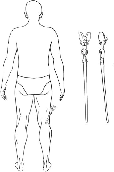 El segundo caso es un contexto excavado por el arqueólogo Carlos Elera en Morro Eten, en el departamento de Lambayeque en la costa norte del Perú. Este contexto, el entierro número 4, perteneciente a la cultura Cupisnique (1200 - 400 a. C.), contiene a un individuo masculino de aproximadamente sesenta años, el cual tiene una altura de 1,8 metros, algo muy poco común para la población prehispánica de los Andes centrales. Este individuo tiene como asociaciones espejos de antracita, espátulas hechas de huesos de cérvidos (aparentes inhaladores) y, lo más sorprendente, una sonajera decorada hecha de material óseo, la cual estuvo incrustada en su fémur derecho (Elera, 1993, 1994) (véase la Figura 7).