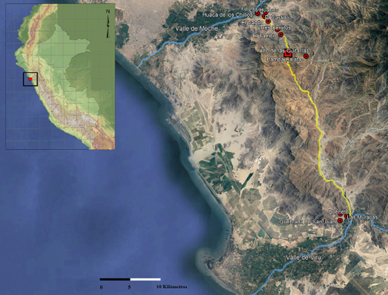 Nota. En círculos rojos se indican los sitios arqueológicos de la ruta intervalle Moche-Virú. En línea amarilla, la ruta entre ambos valles.