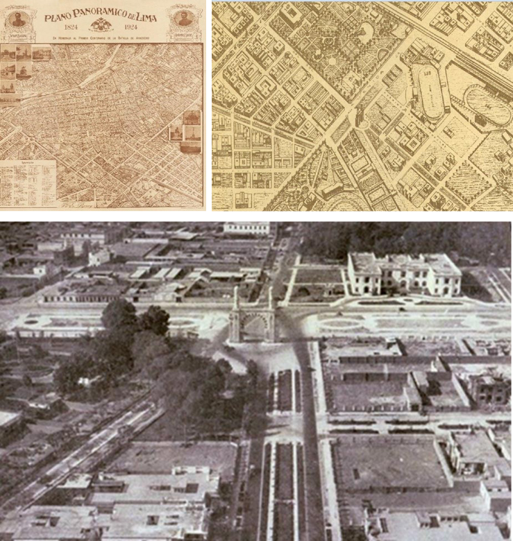 Nota. Arriba: imagen completa y detalle del "Plano panorámico de Lima. En homenaje al primer centenario de la Batalla de Ayacucho" por Julio E. Berrocal, 1924, Librería F. y E. Rosay (https://repocaslit.minedu.gob.pe/handle/123456789/2506?show=full). Con perspectiva isométrica, el plano ofrece una visión muy detallada de las calles, plazas y monumentos de Lima. Abajo: [Foto aérea de Lima con el arco morisco, el Ministerio de Fomento y el inicio de la Av. Leguía] (1926), de Ciudad y Campo, (15), 1. A la derecha, haciendo esquina, se ve el lote donde se construiría el palacete de la Embajada argentina.