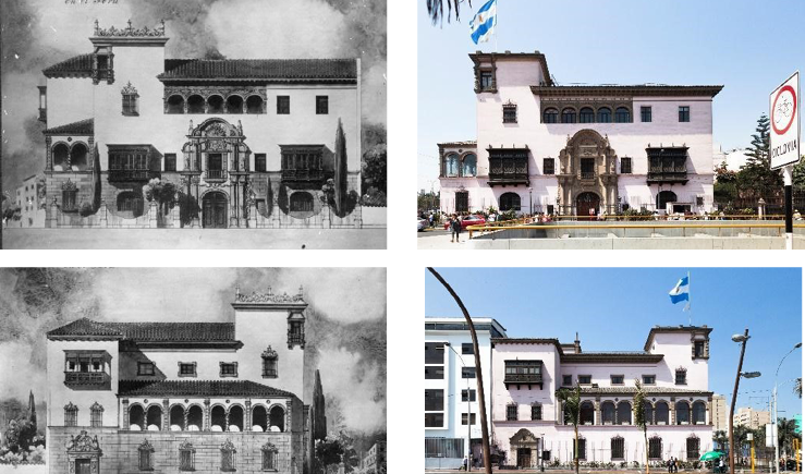 Nota. Arriba, izquierda: Noel, M. (ca. 1927). [Reproducción fotográfica de elevación del palacete de la Embajada argentina, fachada de la Av. Arequipa]. Colección Martín Noel, Fototeca del Centro de Documentación de Arquitectura Latinoamericana. Arriba, derecha: Fabri, M. (2019). Foto del palacio de la Embajada argentina, Av. Arequipa. Reproducido con autorización. Abajo, izquierda: Noel, M. (ca. 1927). [Reproducción fotográfica de elevación del palacete de la Embajada argentina, fachada de la Av. 28 de Julio]. Colección Martín Noel, Fototeca del Centro de Documentación de Arquitectura Latinoamericana. Abajo, derecha: Fabri, M. (2019). Foto del palacio de la Embajada argentina en el 2019, Av. 28 de Julio. Reproducido con autorización.