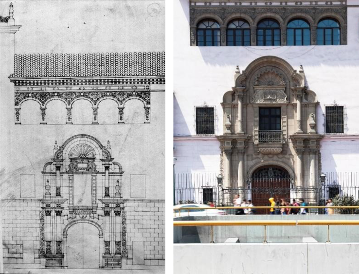 Nota. Izquierda: Noel, M. (ca. 1927), [Plano de la portada del palacete de la Embajada argentina], Colección Martín Noel, Fototeca del Centro de Documentación de Arquitectura Latinoamericana. Derecha: Fabri, M. (2019). Foto de la portada principal del palacete de la Embajada argentina en Lima sobre la Av. Arequipa. Reproducido con autorización.