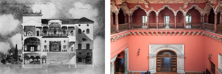 Nota. Izquierda: Noel, M. (ca. 1972). Proyecto para la Legación Argentina en el Perú. Sección. Colección Martín Noel, Fototeca del Centro de Documentación de Arquitectura Latinoamericana. Derecha: Fabri, M. (2019). Patio actual del palacete de la Embajada argentina en Lima. Reproducido con autorización.