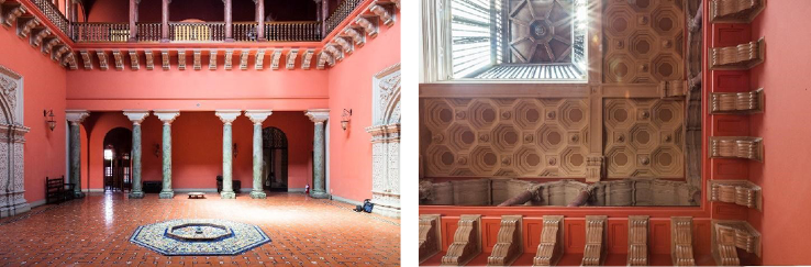 Nota. Izquierda: Fabri, M. (2019). Patio actual del palacete de la Embajada argentina en Lima. Derecha: Fabri, M. (2019). Falso techo de galería de yesería del segundo piso del palacete de la Embajada argentina en Lima. Reproducidas con autorización.