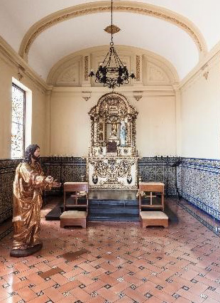 A partir de esta galería se ingresa a la capilla, ambiente característico de las casonas virreinales (véase la Figura 10). La entrada presenta una portada de madera con dos hornacinas laterales. En el interior, el piso es de losetas rectangulares de arcilla con azulejos cuadrados en las esquinas, muy parecido al suelo del patio principal con la pileta. También tiene un zócalo perimetral de azulejos con diseños geométricos en tonos verdes, azules y blancos, similar al del comedor.