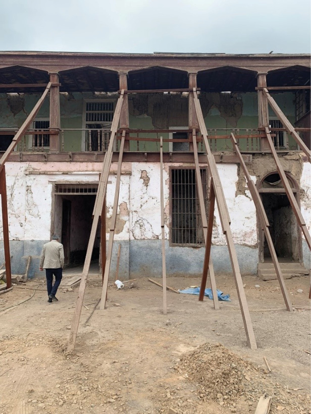 En el sector izquierdo, quedan vestigios del derrumbe de muros y parte de la galería del segundo piso. El proyecto de obra nueva busca recuperar la volumetría del monumento con una estructura de madera ligera, diferenciando la intervención actual, según las premisas de Camilo Boito, y que funcione como nuevo ingreso al museo.