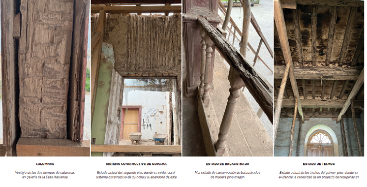 Nuestra zona de actuación se limita a la primera crujía de la casa hacienda, que es la que evidencia el mayor deterioro de todo el conjunto; esta se mantiene apuntalada para prevenir su desplome. En este espacio, con una vista excepcional del entorno, se han identificado dos tiempos de construcción, columnas azapatadas de estilo barroco que se encuentran cortadas y recubiertas por paneles de madera que forman pilares y arcos republicanos. Como se menciona en el contexto histórico, esta fue una remodelación de la época con el fin de modernizar la arquitectura. Afortunadamente, aún se conservan vestigios de ambos tiempos y es nuestra intención dejar evidencia de la historia.