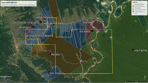 La misma información de este tipo de portales web puede ser extraída para su utilización en otros programas de SIG, simples (como Google Earth) o complejos (como QGIS). La elección de la información específica, que se relaciona con el área minera, permite elaborar mapas más comprensibles para explicar a los actores sociales la relación de superposición del área con sus predios y territorios (véase la Figura 3). Además, el proceso de vinculación geográfica permite individualizar a estos actores y crear un listado preliminar de sujetos de CP a partir de las particularidades iniciales de su forma de posesión territorial.