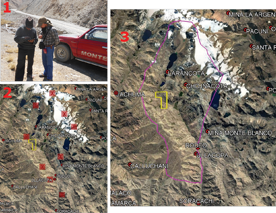 Así, en el caso de no poseer información sobre las titulaciones o el saneamiento del territorio involucrado, esta puede ser obtenida de los propios actores locales. Además de la revisión y análisis de mapas y documentos que puedan correlacionarse con el territorio (son muy pocos los casos de levantamientos topográficos precisos), se ha trabajado en la generación de coordenadas y puntos georreferenciados que representen hitos de correlación espacial, apoyados por anotaciones de campo e imágenes satelitales de alta resolución (a tiempo real) que permiten a los actores construir la información a través de la interacción con el especialista y su herramienta de trabajo. Son múltiples los ejemplos que se tienen, y todos parten de una generación conjunta de conocimiento geográfico (ver Figura 4).