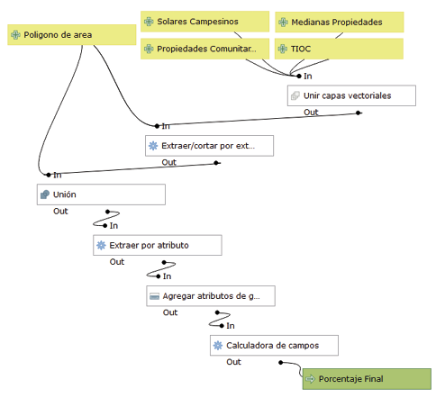 Retomando el caso de nuestra área hipotética, y suponiendo que toda la información hubiese sido obtenida en el trabajo previo de gabinete y los relevamientos posteriores en campo, ahora sería necesario aplicar un análisis SIG para determinar las afectaciones territoriales de cada sujeto identificado. Ello supone que cada población mapeada se halla relacionada con el territorio titulado sobre el que se encuentra, lo que suma un total de diez sujetos de consulta identificados, como se observa en la Figura 3. El principal cálculo, en este aspecto, es la determinación del porcentaje del área minera que es ocupado por predios titulados. Para automatizar el cálculo, se ha creado un modelo que, en resumen, cruza todas las capas vectoriales de entrada (polígono de área y titulaciones) para extraer los fragmentos superpuestos y, en base al área total del polígono de área minera, calcular el porcentaje que ocupan. El modelo se presenta en la Figura 5.
