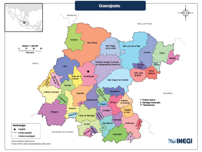 Instituto Nacional de Estadística y Geografía de México (s. f.). Mapa de Guanajuato. División municipal. Cuéntame de México. Sección educativa. https://www.cuentame.inegi.org.mx/imprime_tu_mapa/doc/gto-mpios-color.pdf