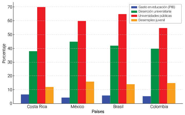 En la Figura 5, se comparan los países de Costa Rica, México, Brasil y Colombia a partir de cuatro indicadores del sistema educativo: gasto público en educación superior como porcentaje del PIB, deserción universitaria, porcentaje de universidades públicas y desempleo juvenil. Los resultados evidencian contrastes significativos entre los países, como el mayor esfuerzo de Costa Rica en inversión pública y la elevada proporción de universidades públicas en la región, así como los altos niveles de deserción y desempleo juvenil observados en algunos casos.