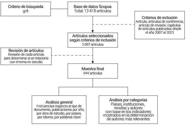 Para garantizar la calidad, transparencia y replicabilidad del estudio, se implementó un proceso sistemático de selección de datos basado en la declaración PRISMA 2020. La fuente utilizada fue la base de datos Scopus, seleccionada por su cobertura multidisciplinaria y prestigio internacional. La búsqueda se realizó por título, resumen y palabras clave. Se utilizó el término grit y la búsqueda se limitó a publicaciones comprendidas entre el 2007 y el 2023, año en que el concepto comienza a consolidarse en la literatura académica.