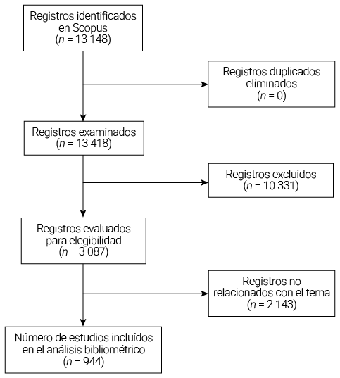 Inicialmente se identificaron 13 418 registros. Posteriormente, se eliminaron duplicados de forma automática y manual, sin registros excluidos en esta etapa. Luego, se aplicaron filtros de año de publicación, área temática, idioma y relevancia del contenido. Los documentos fueron revisados individualmente para confirmar su correspondencia con los tres criterios de inclusión: que se trate de publicaciones científicas revisadas por pares; que sean estudios relacionados con el grit en contextos educativos, psicológicos o de gestión; y que los artículos, revisiones o conferencias estén indexadas en Scopus. Se excluyeron los documentos que no tuvieran vinculación directa con el tema, que estén duplicados o a los que no se tenga acceso completo, y los materiales editoriales o notas de conferencia que carezcan de rigor metodológico.