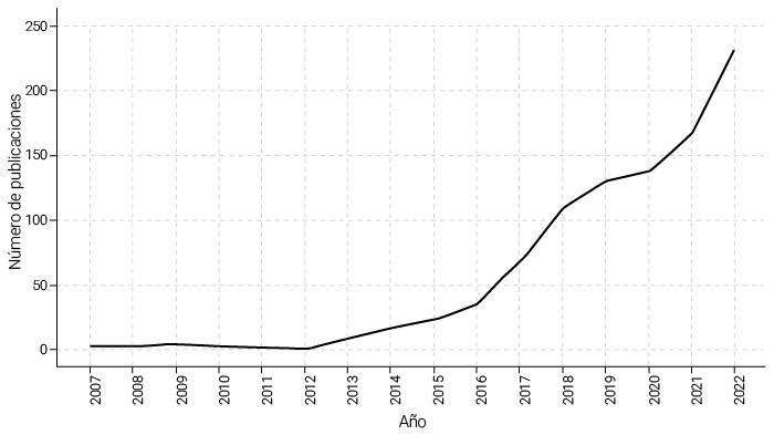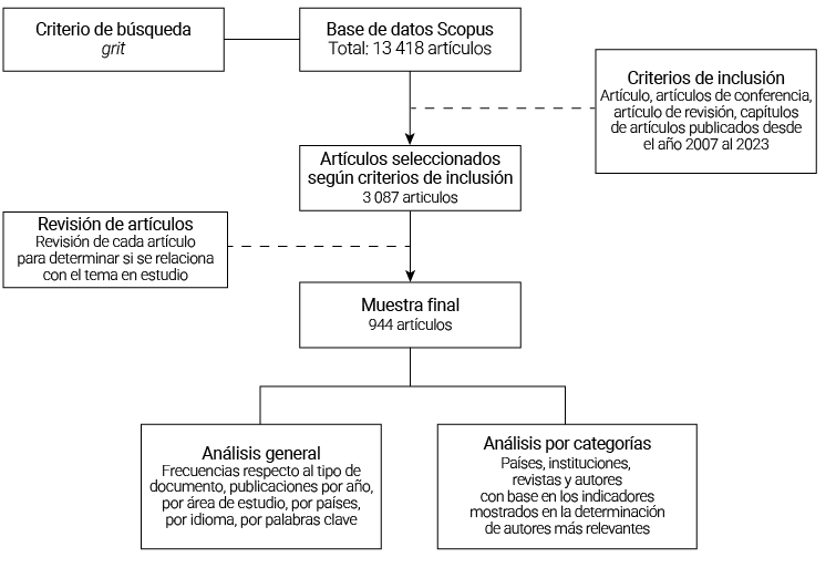 Para garantizar la calidad, transparencia y replicabilidad del estudio, se implementó un proceso sistemático de selección de datos basado en la declaración PRISMA 2020. La fuente utilizada fue la base de datos Scopus, seleccionada por su cobertura multidisciplinaria y prestigio internacional. La búsqueda se realizó por título, resumen y palabras clave. Se utilizó el término grit y la búsqueda se limitó a publicaciones comprendidas entre el 2007 y el 2023, año en que el concepto comienza a consolidarse en la literatura académica.